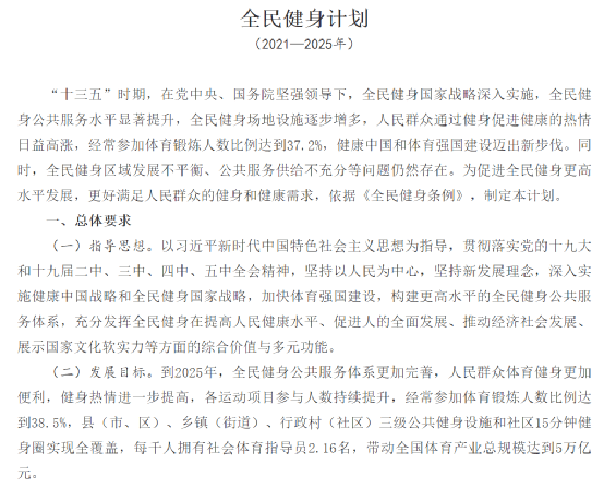 更进一步的还有国务院印发的《全民健身计划(2021-2025年)》,目标到2025年,全民健身公共服务体系更加完善,人民群众体育健身更加便利,带动全国体育产业总规模达到5万亿元。
