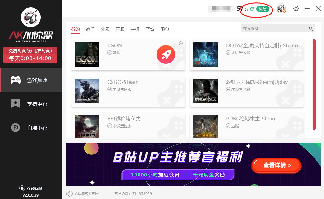 在腾讯加速器宣布退出”群聊”之后,不少小伙伴一时只能忍痛寻找新的加速器,小编纵观市面上所有加速器,经过对比之后推荐大家使用AK免费加速器,首先AK有当下玩家最喜欢的时长暂停功能。