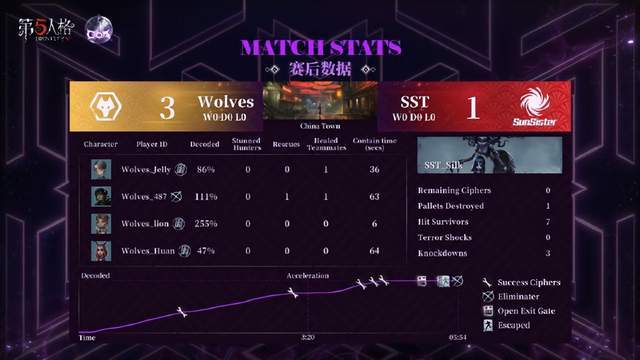 很快,第一场比赛也是拉开了帷幕。双方选手都保持着不错的状态,但是第一场比赛狼队要更胜一筹。上半场里面,狼队的求生者选手运营的非常顺利,利用祭司通道,让SST的选手晕头转向,在牺牲一位选手的情况下,完成了三跑,为队伍拿下了巨高的分数。而下半场就到了Alex发挥的时间了,他选出了赛场上面比较强势的破轮。