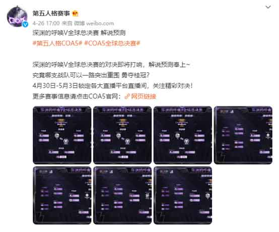 近段时间里面,第五人格的COA5赛事火热的打响了。在经历了半个多月的征程之后,各支队伍也为我们带来了精彩的表现。而最终一轮轮的选拔,淘汰赛也即将在4.30号拉开帷幕,直至5.3号结束,在这个五一小长假里面,相信第五人格的COA5赛事上,各路的职业选手会为我们带来精彩的发挥!