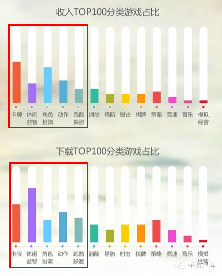 让我们再重新看一下前面那张收入\下载占比图,排在最后的模拟类虽然人气还不足,但不难发现这里手游产品的收入下载比很接近1:1。换而言之就是,模拟类手游在ARPU值与活跃用户数之间能达到一个非常理想的平衡值。要知道在端游和页游领域,高ARPU值一直被部分领导称为“票房毒药”。蓝港CEO王峰早年就曾指出,ARPU值与ADU(活跃用户数)是相互消长的,ARPU值过高会过分破坏游戏平衡性,普通用户也就随之流失。虽然在手游领域,玩家之间的对抗性被减弱,让这一关系得到一定缓和,但实际上还是存在一些影响。比如一些ARPU高同时消费门槛也高的重度产品,逼迫一部分普通用户放弃,导致剩下的核心用户与土豪们在继续支撑,而市场结果就是该产品的收入情况在一路下滑。