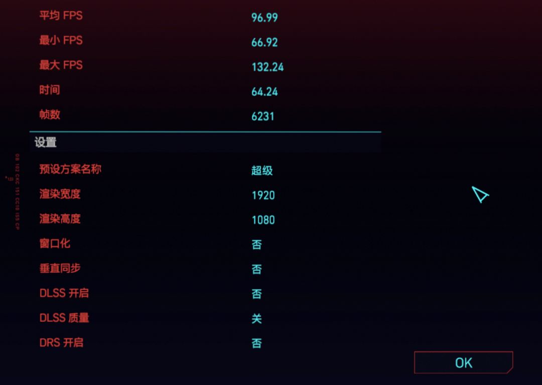 ▲《赛博朋克2077》,采用的是新加入的基准测试跑分,枪神6 Plus超竞版在FHD下最高画质平均帧数达到了97fps,流畅度很高。
