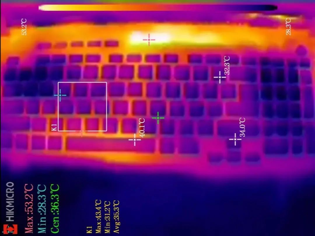 让人惊喜的是该机在增强模式下考机时风扇噪声并不算吵闹,用户位大概是49.5分贝,这在游戏本里算是“安静”的满载机型了。C面的温度也很低,热量堆积区域也就40℃左右,对于非金属材质而言,整个C面摸上去都相当凉快。