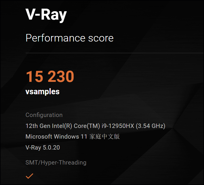 ▲V-RAY5.0基准测试,处理器越强分数越高,枪神6 Plus超竞版i9 12950HX测试成绩为15230,110W款i9 11980HK为11252,95W的i9 12900H为12294。