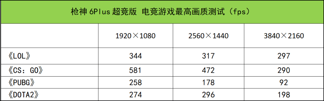 接下来是电竞游戏测试。首先是FHD分辨率,显然,枪神6 Plus超竞版应对FHD可以说是小菜一碟,四款热门游戏都轻松达到240fps以上的平均帧速,就算是对硬件要求较高的《PUBG》,平均帧速也达到了258fps,性能十分强悍。其次是2.5K分辨率,测试帧速为178fps——472fps,同样流畅度极高,配合该机内置的2.5K 240Hz刷新率3ms响应时间电竞屏,玩家能得到顺滑流畅无拖影的游戏体验。最后是4K分辨率,依然无压力,你完全可以利用该机外接4K高刷显示器玩电竞游戏,画质帧速都很出色。