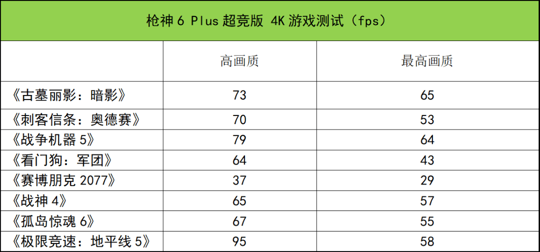在2.5K最高画质下,枪神6 Plus超竞版的实测平均帧速都能达到60fps以上的平均帧速,全部游戏表现都不错。同时相比115W的RTX 3080Ti,依然有较大幅度的性能领先,例如《古墓丽影:暗影》《战争机器5》《赛博朋克2077》《战神4》以及《孤岛惊魂6》等游戏。此外,相比165W的RTX 3080,整体领先,部分游戏领先幅度不错,部分游戏优势较微弱。