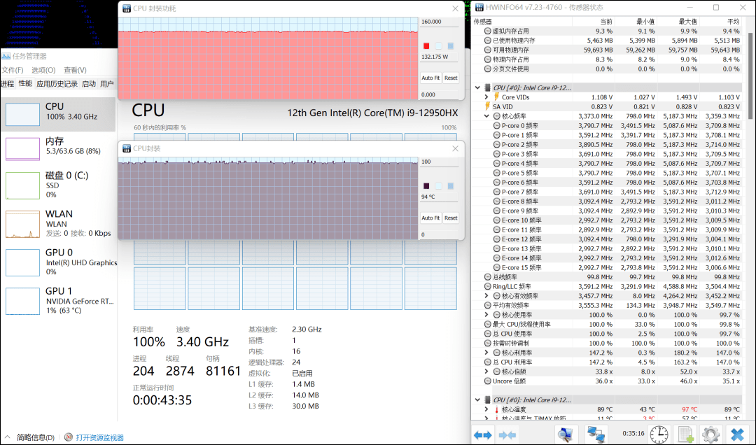 如下所示,在室温24℃左右,对枪神6 Plus超竞版进行单考处理器(FPU)测试(测试时机器设定为“增强模式”以模拟用户真实满载情况),持续考机半小时,该机的处理器运行状态如下:i9 12950HX最初爆发能到160W以上,稳定在130W左右,截图时的实时状态是132W/3.4GHz/94℃,处理器的性能输出十分平稳,其中大核频率3.6GHz—3.9GHz,小核频率2.9GHz—3.1GHz,这样狂暴的性能表现,枪神6 Plus超竞版的确称得上是当前最强i9处理器游戏本!