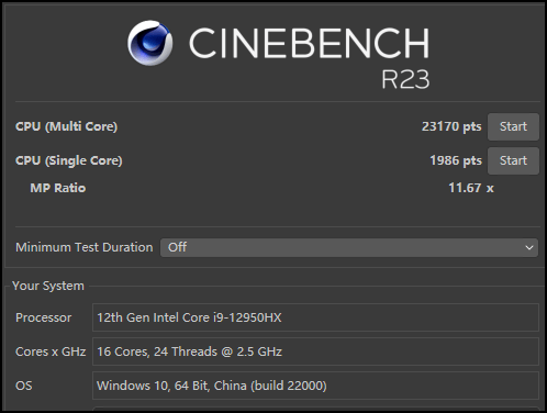 ▲CineBench R23测试,枪神6 Plus超竞版i9 12950HX的多核测试拿到了23170pts的高分,相比之下,110W款i9 11980HK为15152pts,比上代猛机提升了约53%,95W的i9 12900H为18041pts,超出幅度约27%。同时,单核1986pts也非常亮眼。