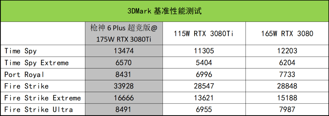 牛叔引入了115W的RTX 3080Ti和165W的RTX3080(去年的满血旗舰)作为性能参考对象,分为基准性能测试和实战性能(FHD/2.5K/4K)测试,其中FHD和2.5K为枪神6 Plus超竞版自带屏幕测试,4K为外接显示器测试。