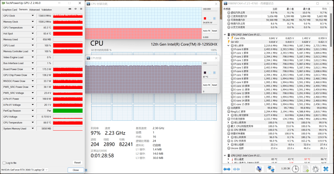 室温24℃左右,对枪神6 Plus超竞版进行双考测试,半小时之后的情况如下所示:i9 12950HX处理器的封装功耗约为55W,大核频率在2.4GHz左右,小核频率在2.0GHz左右,温度约87℃;RTX 3080Ti的功耗在175W左右波动(大致范围是165W——180W),温度约85℃。在增强模式下可以稳定CPU 55W+GPU 175W的性能输出。值得注意的是,RTX 3080Ti的功耗极高,一般游戏本考机时,独显只能维持默认功耗,不会触发动态功耗,而该机达到了最高功耗。