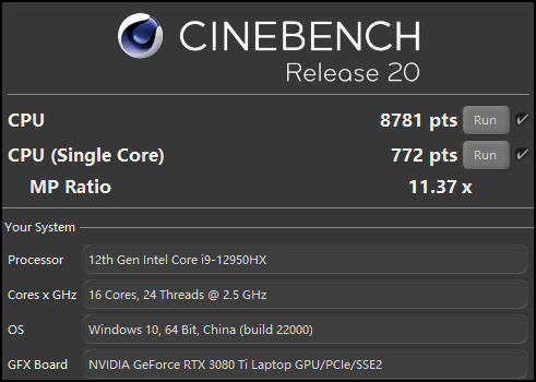 ▲大家熟悉的CineBench R20测试,枪神6 Plus超竞版i9 12950HX的多核成绩为8781pts,单核772pts。作为参考,110W款i9 11980HK的多核分数是5526pts,单核620pts;95W的i9 12900H的成绩是6852pts/726pts。相比前代8核16线程处理器,16核24线程的i9 12950HX可以说是完全碾压,提升幅度达到了59%左右,同时也大幅度领先95W的i9 12900H。