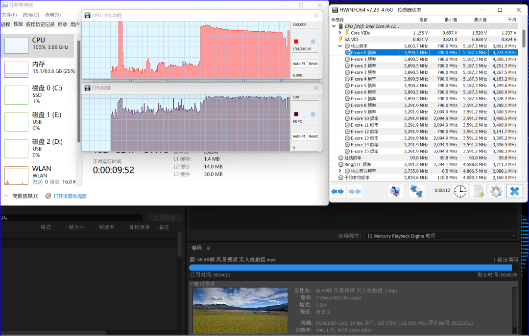 视频转码(软件方案)也是可以吃满处理器的应用,可以看到,枪神6 Plus超竞版i9 12950HX跑完全程耗时为4分18秒,依然是目前最快的成绩。