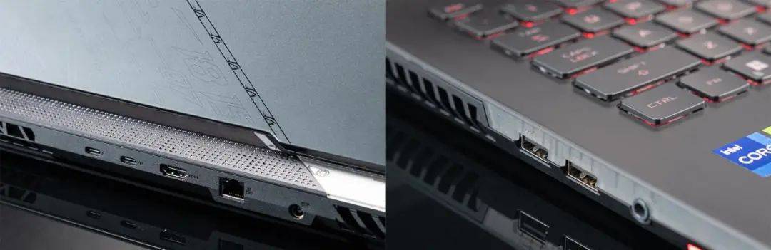 接口方面,枪神6 Plus超竞版机身左侧有两个USB大口,尾部有两个Type-C口(一个是雷电4,一个是全功能口),一个HDMI2.1口以及一个RJ45有线网口,机身右侧是一个钥石插槽。扩展性强大,种类也丰富。但有一点在牛叔看来可以优化,比如把一个Type-C口移到机身侧面来,这样外接C口设备时会更方便一些。