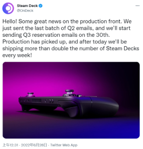 6月28日,Valve宣布他们计划从本周开始提高Steam Deck的出货量,官方在推特中表示未来每周会发出超过原来两倍数量的Steam Deck。在此之前,该掌机由于材料短缺推迟发售,导致订单持续积压,根据早期估计,V社至少要在今年10月才能清理完目前积攒的订单。