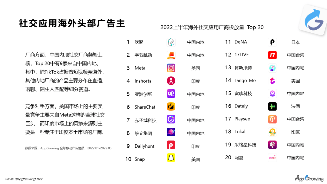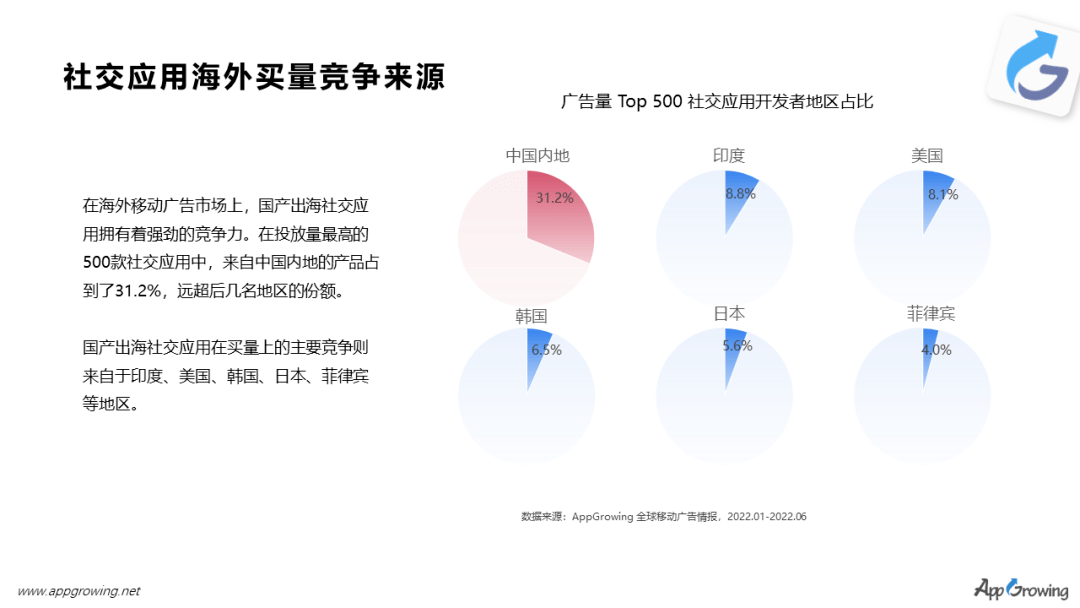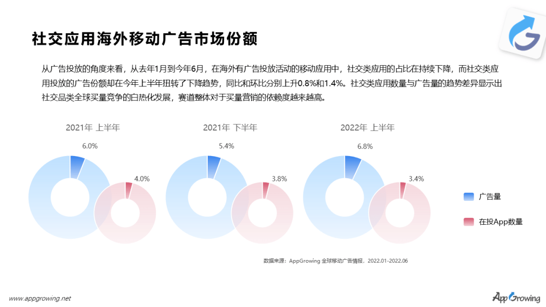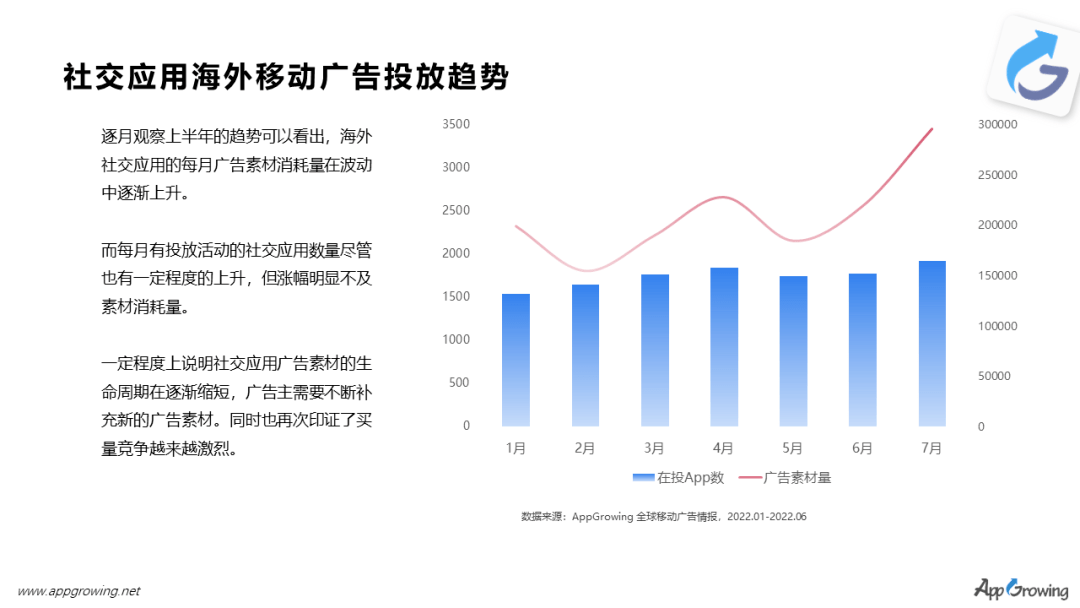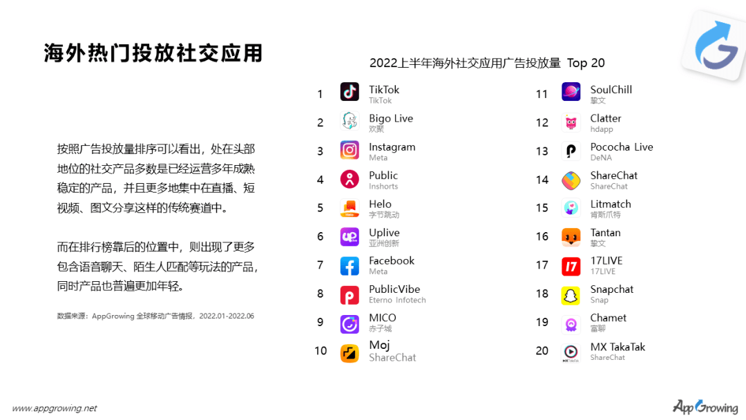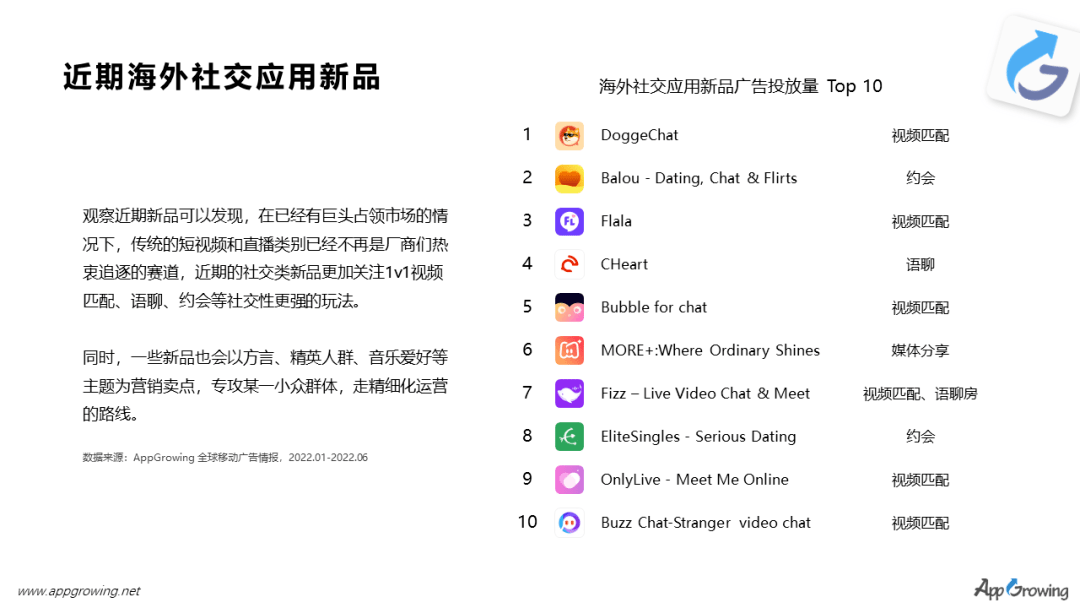 AppGrowing国际版根据 2022 年上半年海外社交类应用移动广告投放数据发布《社交应用出海趋势洞察与爆量密码》报告,解读多元时代下,泛娱乐社交应用的差异化增长之道。