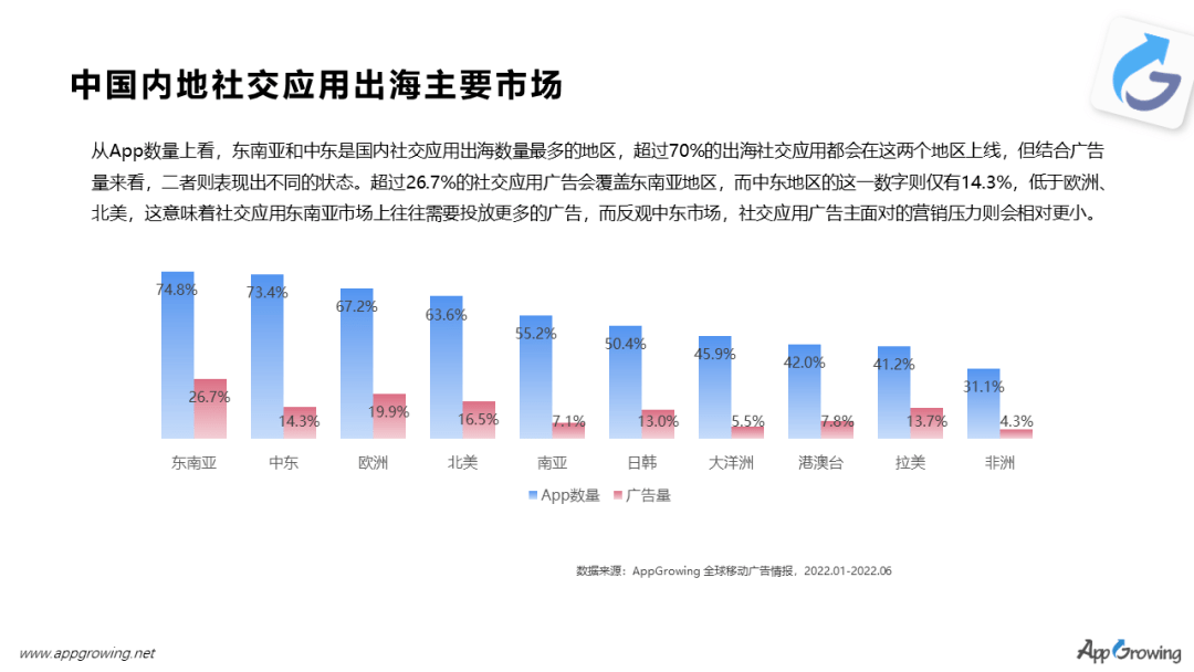 东南亚和中东是国产社交应用出海数量最多的地区,超过70%的出海社交应用都会在这两个地区上线。