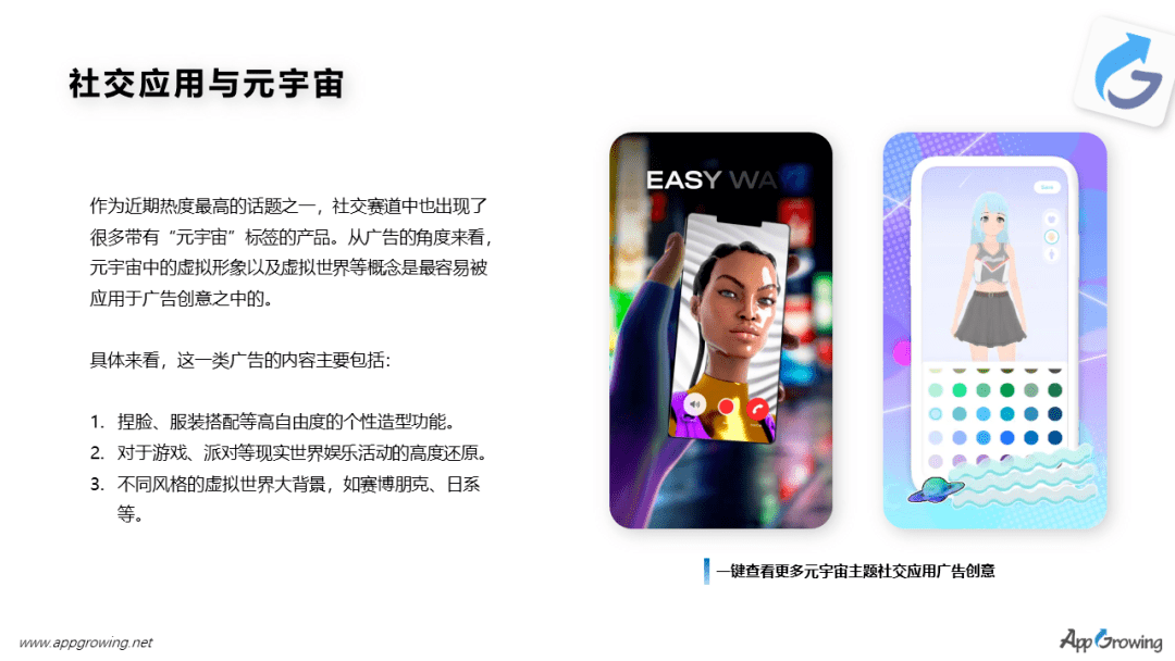 作为近期热度最高的话题之一,社交赛道中也出现了很多带有“元宇宙”标签的产品。从广告的角度来看,元宇宙中的虚拟形象以及虚拟世界等概念是最容易被应用于广告创意之中的。