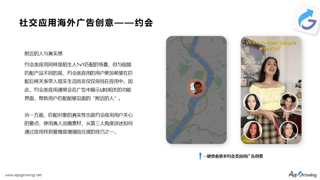 约会类应用的用户往往更加希望在匹配后将关系带入现实生活而非仅仅保持在应用中。因此,在广告中能够见面的“附近的人”,或是使用真人出镜素材,从第三人角度讲述如何通过应用找到爱情是增强信任度的技巧之一。