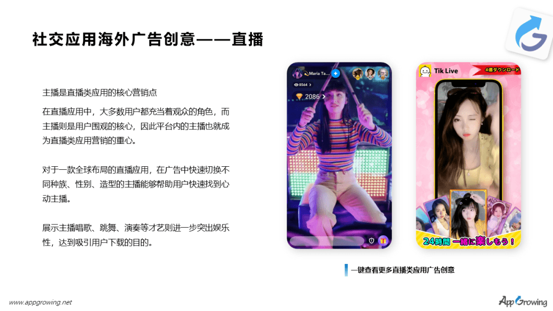 针对不同的细分赛道,AppGrowing国际版也观察到不一样的素材创意趋势。例如,直播应用的广告往往以“主播”作为核心营销点,在广告中快速切换不同种族、性别、造型的主播,从而帮助用户快速找到心动主播。