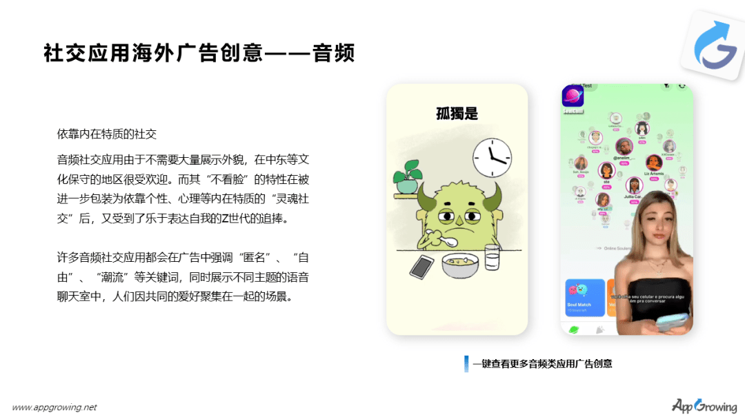 许多音频社交应用都会在广告中强调“匿名”、“自由”、“潮流”等关键词,同时展示不同主题的语音聊天室中,人们因共同的爱好聚集在一起的场景。