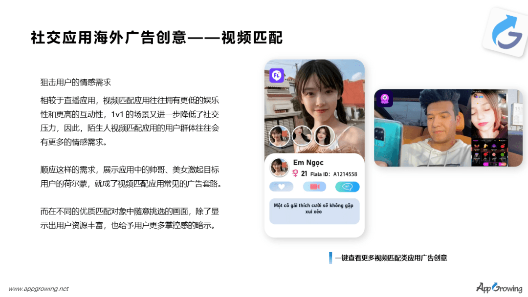 视频匹配应用则通过展示1v1互动聊天和左右滑动切换对象的场景激发用户荷尔蒙,狙击情感需求。