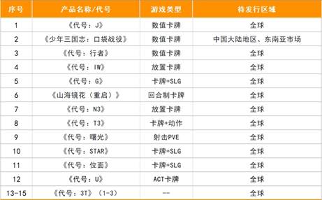 基于“卡牌+”和“精品化”路线,游族在夯实卡牌品类优势的同时分别从题材、玩法、美术和品类融合等多个维度进行创新,不断提升优势品类的品质,现阶段游族在研产品储备丰富。其中包括数值卡牌游戏《代号:行者》、数值卡牌游戏《少年三国志:口袋战役》、卡牌+SLG类游戏《代号:G》、回合制卡牌游戏《山海镜花(重启)》、放置卡牌游戏《代号:N3》、卡牌+动作类游戏《代号:T3》、射击PVE游戏《代号:曙光》、卡牌+SLG游戏《代号:STAR》、卡牌+SLG游戏《代号:位面》、ACT卡牌游戏《代号:U》等。此外,游族正在进行《三体》系列IP游戏开发,预计将于未来3-5年陆续推向市场。