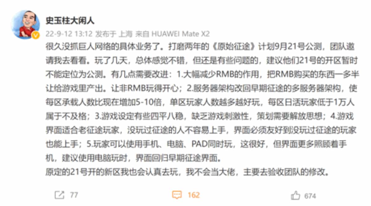 史玉柱昨日在社交媒体上发文,透露了他近期试玩《原始征途》公测版本的感受。这条几百字的微博,用了6个字来肯定研发团队的成果,用了300多字来提意见,以至于在内部看来这点“很史玉柱”。