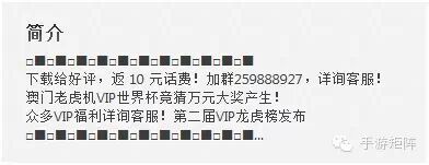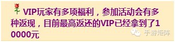 而每个下载用户会返10元话费,下载反而成了一种推广烧钱的方式。所以《澳门老虎机》在盈利方式上另辟蹊径,推出了VIP服务,所谓VIP服务即是只要你一次充值648元人民币,即可参与一些只能VIP才能参与的活动,比如:每月最高游戏得分排行,世界杯竞猜等。说白了,VIP服务即是将将虚实货币兑换,换了一种说法。