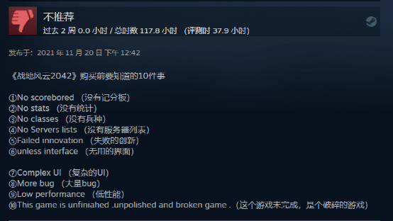 一些在宣传阶段就已经轰动游戏圈的大作,如《赛博朋克2077》,《战地 2042》等,都用它们首发时的糟糕表现伤了玩家的心。难怪许多玩家在失望之余也对现在的游戏逐渐失去信心,“谁预购谁傻”的论调越来越流行。