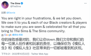10月19日,EA举办的《模拟人生》峰会展示了《模拟人生》新作“Project Rene”消息以及《模拟人生4》的可玩内容。在峰会结束后,英国黑人Twitch的联合创始人指出,峰会的创作者作品展示仅有一位黑人创作者的作品,这让人感到失望。