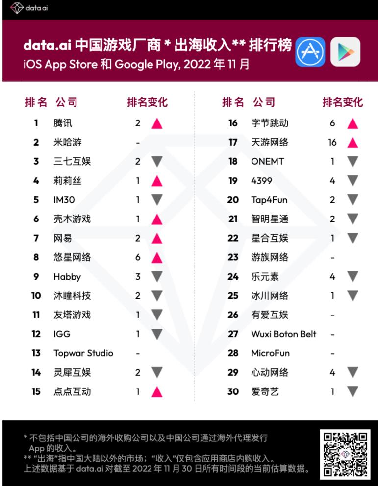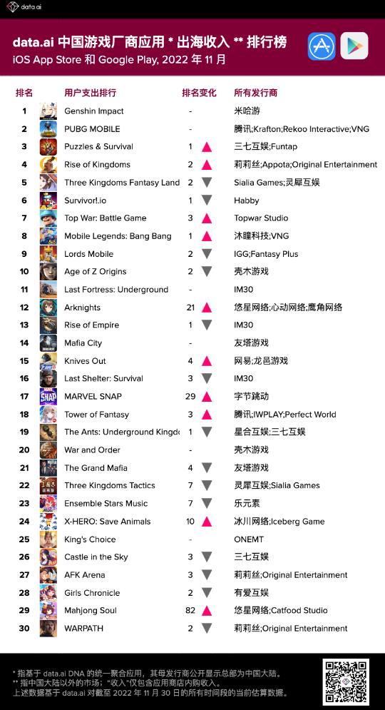 11月中国游戏厂商及应用出海收入排行榜出炉,游戏厂商收入榜单前五名(按排名先后顺序)为腾讯、米哈游、三七互娱、莉莉丝、IM30。相比十月,腾讯排名上升2位,成为收入榜单第一。莉莉丝排名上升1位,获得第四。在头部榜单位置,壳木游戏、网易、悠星网络排名都有上升,其中悠星网络表现最为突出,排名前进6名至第八。悠星网络旗下经营《明日方舟》、《碧蓝航线》、《复苏的魔女》等多款代表性游戏。其中《明日方舟》(Arknights)和《雀魂麻将》(Mahjong Soul)两款游戏本月收入大幅上涨,在日本市场表现尤其出色,帮助悠星网络成功进入11月收入榜单前十。