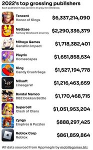 腾讯网易米哈游包揽2022全球手游发行商收入榜前三,5款游戏进入收入榜前10