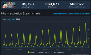 根据SteamDB公布的数据,当下爆火的狼人杀游戏《鹅鸭杀》,在1月5日迎来了新一波的玩家在线高峰,同时在线人数超过56.3万人,在此之前,游戏官方为了应对大量涌入的新玩家,紧急拓宽了服务器容量。