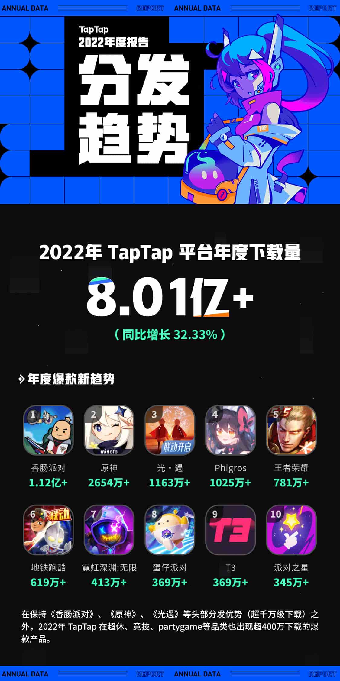 那么在这个不平凡的2022年,一直以来努力帮助玩家们「发现好游戏」的TapTap,又发生了哪些变化,有哪些值得关注的数据,从这些数据中,能看到哪些行业的趋势呢?就让我们一起通过这份《2022 TapTap年度报告》,从TapTap的视角,观察过去一年中手机游戏行业中那些有趣的、特别的、可能被忽视的点点滴滴吧。