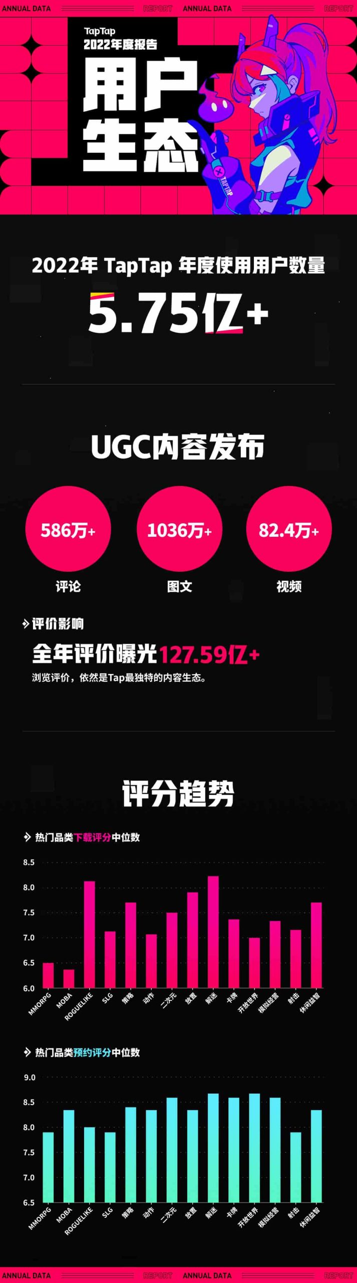 2022年,玩家在TapTap的游戏评价获得了超过127亿的曝光,可玩性、运营服务等更细化的评价维度的引入也为玩家提供了更具参考性的评价形态。TapTap的游戏评价和评分仍然保持着独特的内容生态和影响力,同时也是厂商对于玩家口碑反馈最为直观的参考。