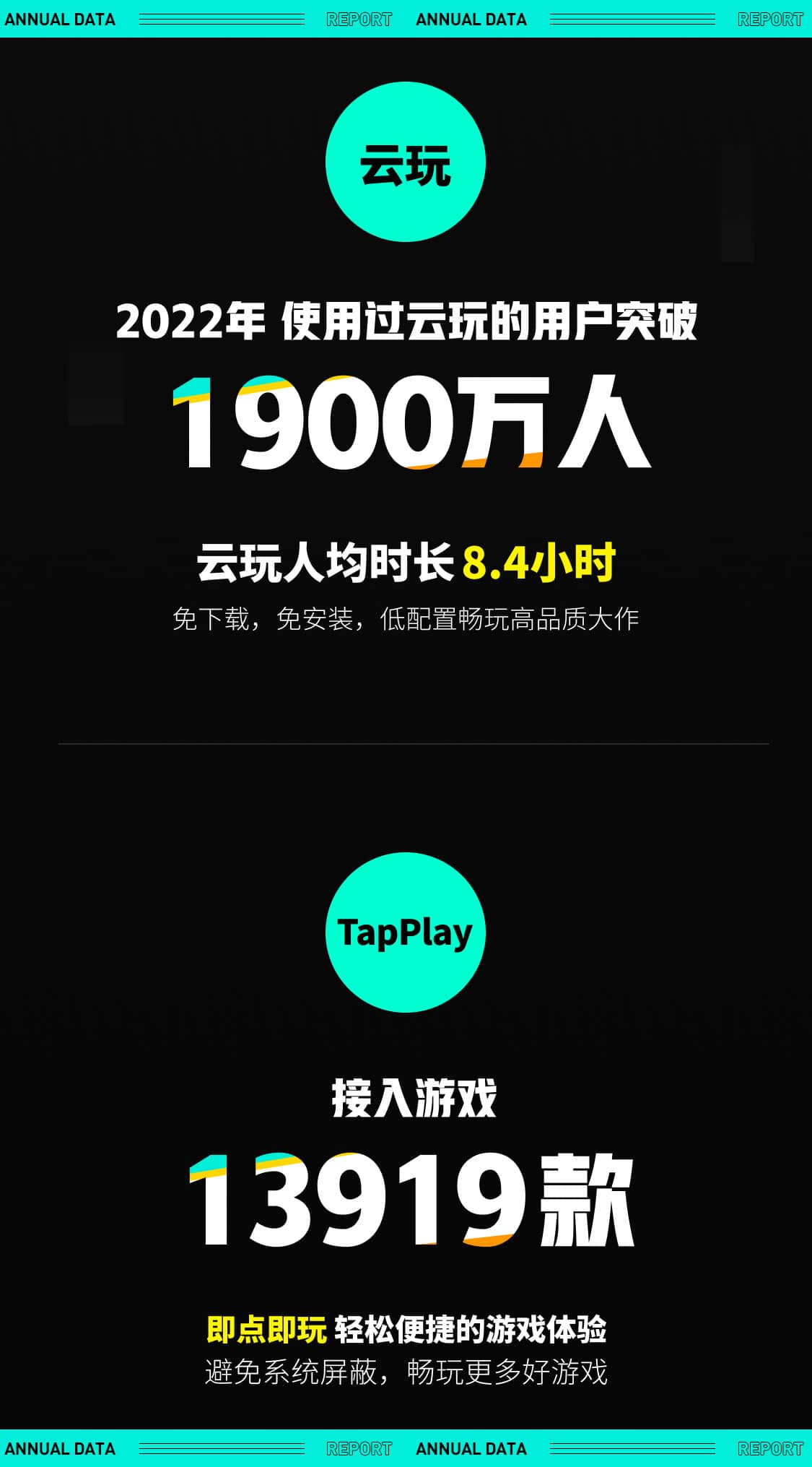曾经云游戏是一个属于主机和PC游戏的概念,用手机去“云玩”一款手游曾经是难以想象的场景。但手游大作配置要求和安装包体积的水涨船高,成了低配置、低容量手机难以越过的障碍。2022年,超过1900万玩家使用过TapTap的云玩服务,人均时长达到8.4小时,免下载、免安装、低配置畅玩高品质大作的手机云玩服务,让更多玩家能够用最低的成本克服手机配置的障碍,体验到高质量的游戏作品。手机游戏更大的用户基数和相对更低的云玩价格,让手游云玩有了更大的想象空间,而随着登陆PC、主机的跨平台手游逐渐成为主流,手游大作配置要求的提高是可以预见的结果,手游云玩将会是更多玩家体验手游大作的必要工具。