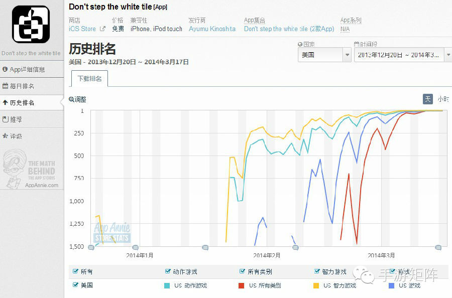 自从《Flappy Bird》火爆之后,无数类《Flappy Bird》开始一涌而现,不过就在开发者们还在上架新的《flappy XXX》的时候,一款叫做《Don’t step the white tile》的游戏杀入到苹果免费榜前三。这是一款发布在2013年底的游戏,在2014年2月底突然发力,直到3月初,成功杀入TOP3。与此同时,新上线的一款名为《Red Bit Escape》的小游戏因其简单的操作进入了免费榜前10。