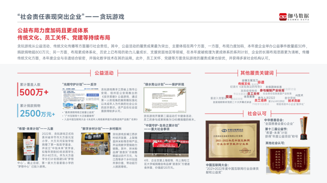报告显示,贪玩游戏在公益活动、传统文化等方面布局较佳。公益活动方面,2022年企业布局事件超30项,累计捐款捐物已达2500万元,覆盖超500万人。传统文化方面,本年度与非遗、数字技术结合较密。其中,公益活动的履责成果最为突出,主要体现在两个方面,一方面,布局力度加码,本年度企业举办公益事件数量超30件,捐款捐物超800万元;另一方面,布局更成体系化,历史上已布局的助力儿童成长、支援贫困地区等领域,在本年度被梳理为更成体系的系列计划,企业的长期布局思路更为清晰。传播传统文化方面,本年度企业与非遗结合较密,并强化数字技术在其的运用。此外,员工关怀、党建等方面贪玩游戏的履责成果也较优,并获得多家社会机构认可。
