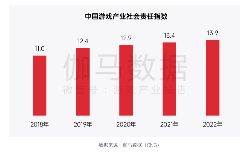 2022年中国游戏产业社会责任指数达13.9,连续4年增长,各项维度的均衡与深入发展是指数增长的主要因素。其中,均衡发展体现在构成指数的四项维度均正向增长,且部分细分领域较为突出,例如未成年人保护成果显著、负面事件报道创新低;深入发展体现在产业持久布局不同社会责任领域,且本年度成果产出较多,围绕可持续发展的思路升级现有履责布局的企业明显增加。