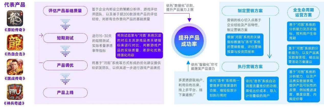 细分领域方面,贪玩游戏或将延续成功率较高的历史成果,数值相关领域更需重点关注,例如已有展现的MMORPG。数据化、智能化是较高产品成功率的保障,数据化的作用主要在于,帮助企业识别、提升产品的潜力上限,这部分主要基于能够自动生成分析标签的“河图”系统以及游戏分析团队实现;智能化的作用主要在于,尽可能多地将产品潜力变现,这部分主要基于以低误差执行原定计划的“洛书”系统及营销经验实现。换言之,经过数据化、智能化的加持企业能够以低于产业均值的风险,研运回报率高于产业均值的产品,二者空间即为贪玩游戏的长期潜力。
