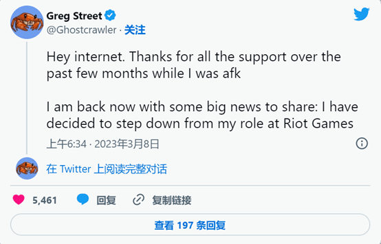 他今天在Twitter上说,他已从Riot MMO辞职,赞扬了为开发Riot Games备受期待的游戏而建立的团队,现在是时候将移交给接下来的人了。他还表示“到时候MMO推出时,我将和你们一起体验”。