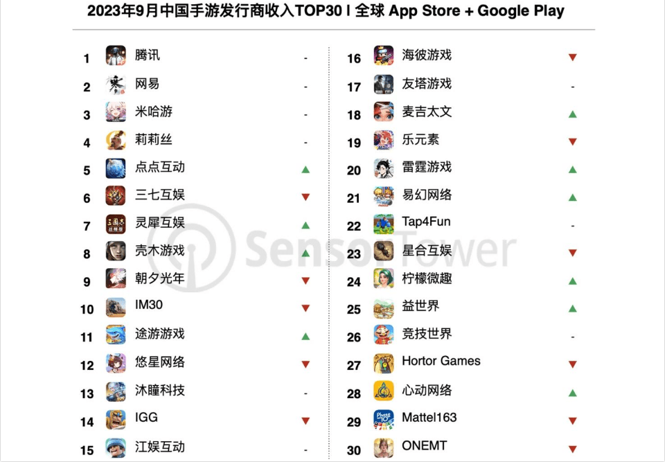 图 1 Sensor Tower 2023年9月中国手游发行商收入TOP30