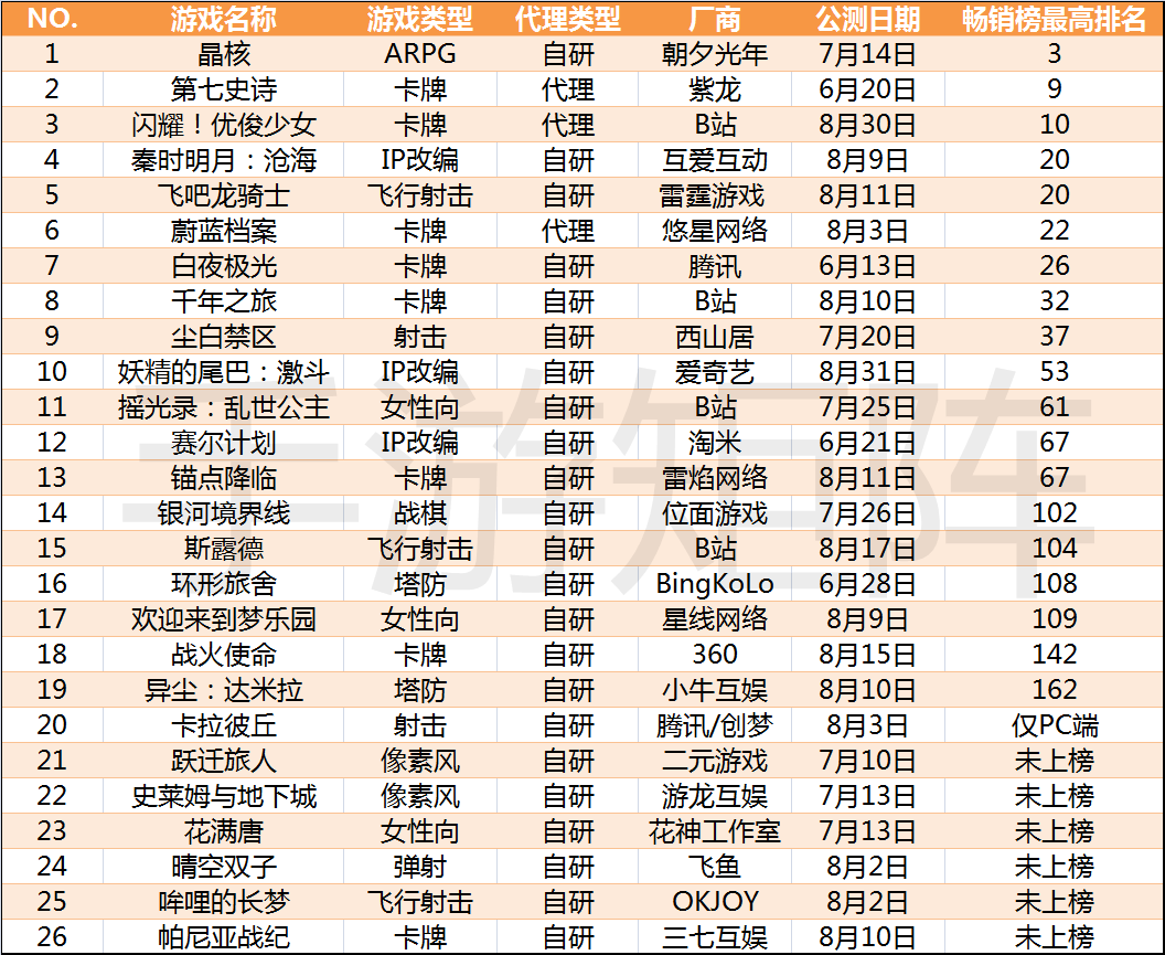ACGx简单整理了今年暑期正式公测的二次元游戏列表,共计有26款游戏参与了暑期的厮杀。如果算上临近上线却取消项目的几款二游,这个数字可以突破30,相当于整个暑期平均两天就有一款新游戏在上线。在9月,已确定上线日期的二游也已经有5款。光是看这些数字也能感受战况有多激烈了。