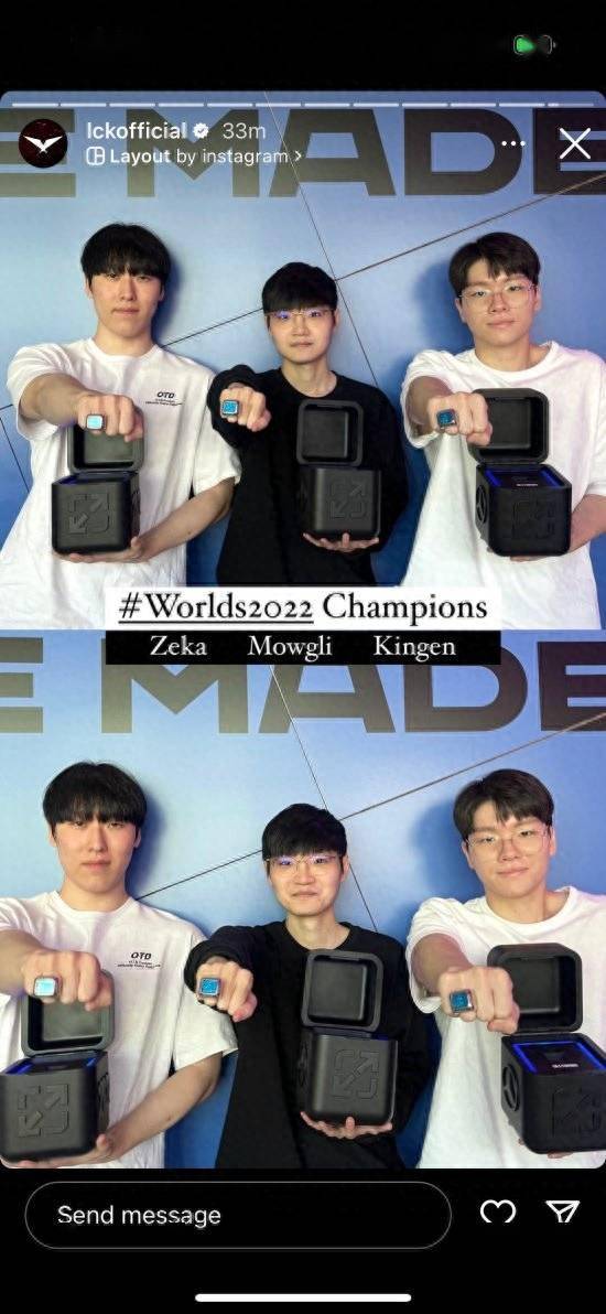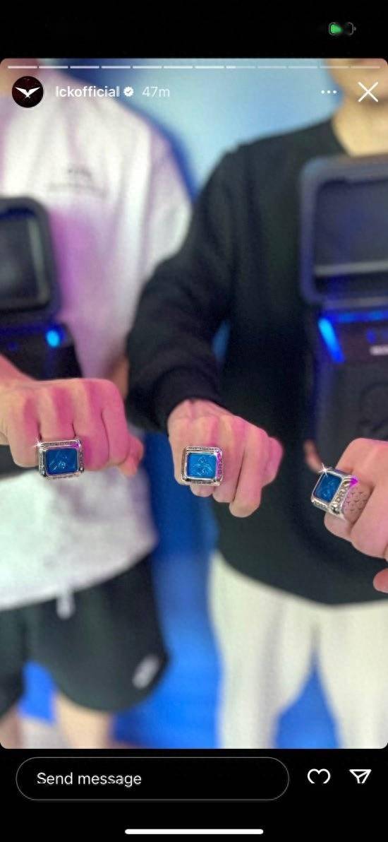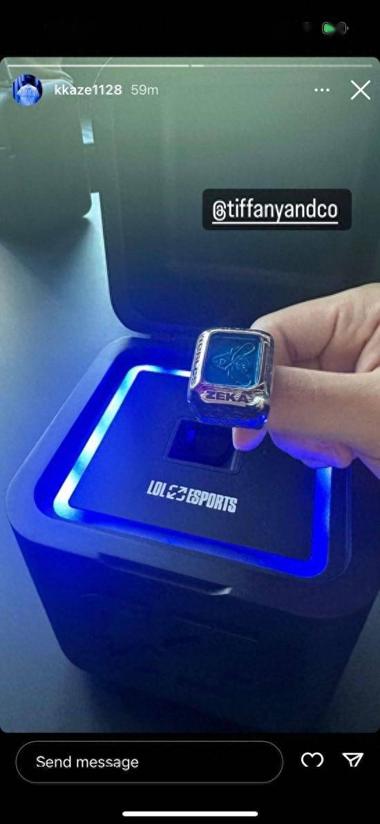 Kingen、Zeka等老DRX队员集体在ins上晒出了他们去年夺冠的冠军戒指。