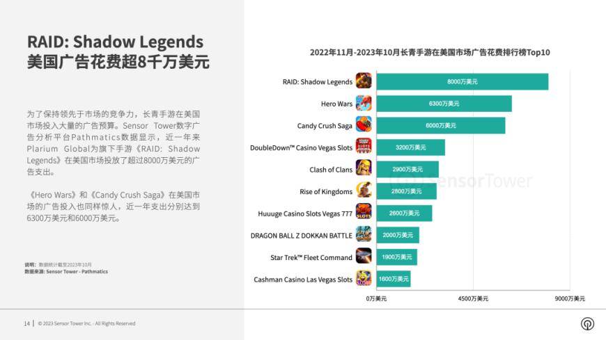 Sensor Tower 数字广告分析平台 Pathmatics 数据显示,长青手游在美国市场的广告预算最高,最近一年 Plarium Global 旗下手游《RAID: Shadow Legends》在美国市场的广告支出超过 8000 万美元(当前约 5.86 亿元人民币)。