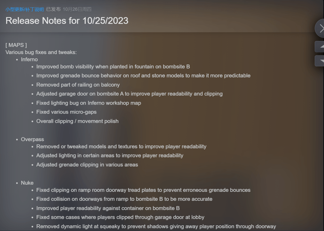 自9月28日 CS2 正式上线后,仅一个月V社对其的更新量就达到了十分惊人的体量,玩家纷纷笑称“这一个月的更新量抵得上过去一年,哦,不两年了”。