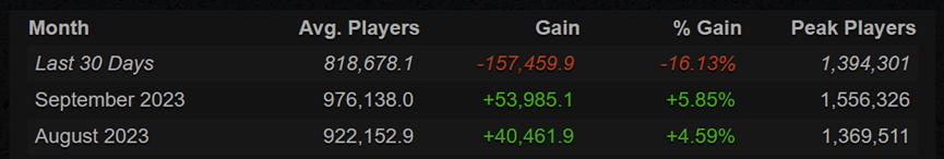 从玩家数量来说,CS2 自更新后,整体玩家在线值甚至开始下滑了,除去刚上线时玩家在线人数最高达到了139万,后续一个月中,不论是平均在线人数、新增玩家数量还是增长率都有显著下滑。