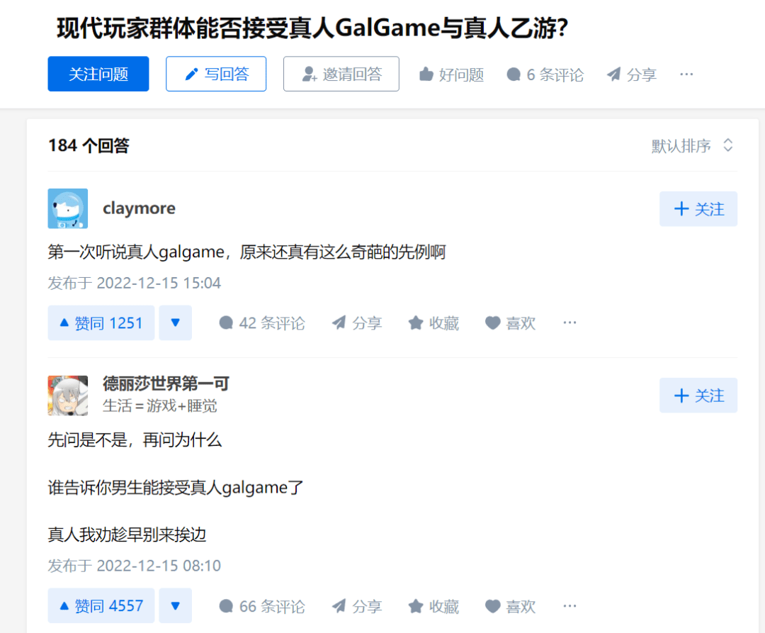 事实上在2022年时,知乎就有过问题“现代玩家群体能否接受真人GalGame与真人乙游?”,在184个回答中,你同样能看到不论男女,超九成的回答都是“不能”。