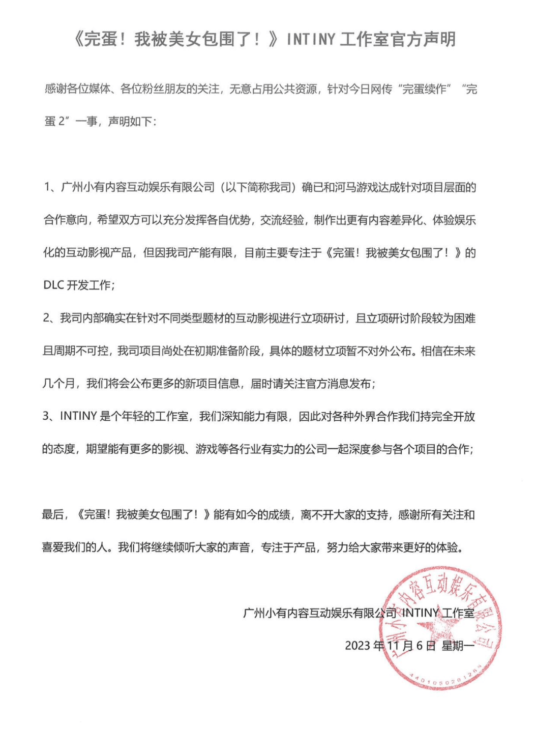 随后晚间时分,INTINY工作室确认了这个消息,但声称公司产能有限,不同类型题材的互动影视项目确实在进行立项研讨,但仍处在初期准备阶段,目前仍主要专注于《完蛋!我被美女包围了!》的DLC开发工作。