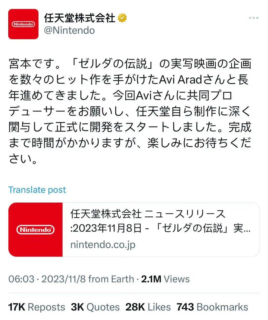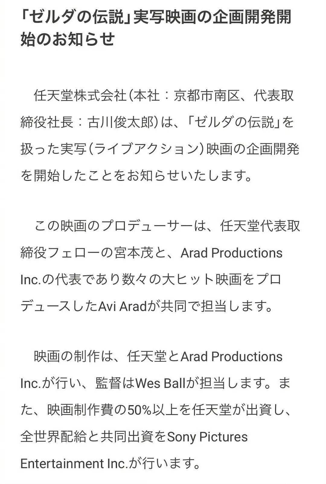 对此,宫本茂也就此事表示了自己的看法:我是宫本,多年来我们与曾制作过许多热门电影的Avi Arad先生一直在推进《塞尔达传说》真人电影企划。本次我们委托Avi Arad先生担任联合制作人,正式开始电影开发,任天堂也将深度参与其中。完成还需要一些时间,敬请各位粉丝期待。